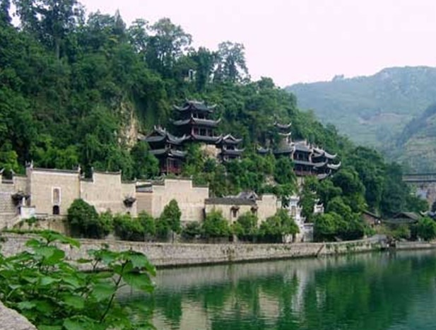 青龍洞古建筑群坐落在中國歷史文化名城——鎮(zhèn)遠(yuǎn)城東的中和山上。這里山勢挺拔,峭壁懸崖。巨巖、洞穴和為一體。道、儒、佛三種宗教的寺廟群生就山腰。它背靠青山,面臨綠水,貼壁臨空,五步一樓,十步一閣,翹翼飛檐、雕梁畫棟。這些古建筑依山因地,分別采用了“吊”、“借”、“附”、“嵌”、“筑”等多種工藝,硬是在一段懸崖上筑出中元洞、紫陽洞、青龍洞、萬壽宮等一片閣樓洞天。