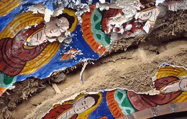 吉木薩爾千佛洞坐落在天山北麓距吉木薩爾縣城西南5km的黃土崗上,向北有小路與烏奇公路相通,交通便利.千佛洞建筑呈東西向的長方形,東面有山門。正殿坐西朝東,土木結(jié)構(gòu),南北兩則建有配房,磚木建筑。正殿為一有斗拱的硬山頂建筑,分前、中、后堂三部分。前堂塑有丈許高的釋加佛像一尊,中堂面闊三間,繪有佛說法圖,18羅漢等塑像;后堂塑有臥佛一尊;三部分緊密相連,構(gòu)成一個整體。