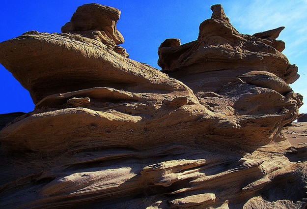 魔鬼城內(nèi)有許多惟妙惟肖的巖石造型,比如阿拉伯的清真寺,柬埔寨的吳哥窟,西茂的布達拉宮等等。有的還像農(nóng)婦晚歸、壯士觀天、和尚念經(jīng)、八戒睡覺、黃牛耕耘、熊貓打站、鯉魯出水、猴子守山。這些似人似物的造型,全都栩栩如生。在地質(zhì)學(xué)上,魔鬼城被稱為風(fēng)蝕地貌或雅丹地貌。這種地貌是由三疊系的各色沉積巖、侏羅系的各色覺積巖和白堊系的各色沉積巖組成的,經(jīng)過雨水的沖刷和風(fēng)力的切割,版權(quán)所有山東聊城聊之旅國際旅行社有限公司,轉(zhuǎn)載必究!天長日久就形成了這樣絢麗多彩姿態(tài)萬千的自然景觀。在克拉瑪依市烏爾樂鄉(xiāng)東南三公里,有一處獨特的風(fēng)蝕地貌,定名為風(fēng)城,人們習(xí)慣稱它為“魔鬼城”。“魔鬼城”方圓約10平方公里,地面海拔350米左右。大約一億年前的白堊紀時,這里是一個巨大的淡水湖,湖岸生長著茂密的植物,后來經(jīng)過兩次大的地殼變動,湖泊變成了間夾著砂巖和泥板的陸地瀚海,地學(xué)上稱它為“戈壁臺地”。 由于風(fēng)雨剝蝕,地面形成深淺不一的溝壑,裸露的石層被狂風(fēng)雕琢得奇形怪狀,在起伏的山坡上,布滿血紅、湛藍、潔白、橙黃的各色石子,宛如魔女遺珠,更增添了幾許神秘色彩,內(nèi)城地處風(fēng)口,四季多風(fēng)。每當(dāng)大風(fēng)喬來,黃沙遮天,大風(fēng)在風(fēng)城里激蕩回旋,凄厲呼嘯,如同鬼哭,“魔鬼城”因此面得名。