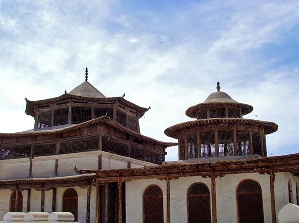 哈密回王陵由墓群和艾提尕爾清真寺(兩部分)組成。墓群原有土木結(jié)構(gòu)的大小拱拜六座,埋藏著歷代回王及其王妃,現(xiàn)剩兩座,最大的拱拜(墓葬)為七世回王伯錫爾、回王福晉以及八世回王莫合買特及其王妃、王族等40余人的墓。該拱拜高17.8米,下部呈長方形,東西長20米,南北寬15米。上為穹隆頂,墓門兩側(cè)塔柱中空,有臺(tái)階盤旋而上,可至墓頂。拱拜南側(cè),有木質(zhì)亭式拱拜2座。東部一座為九世回王沙木胡索特拱拜;西部一座為臺(tái)吉拱拜。九世回王拱拜底部正方形,邊長各15.5米,內(nèi)部以土坯壘砌伊斯蘭式的穹隆頂墓室,外部于垣墻內(nèi)及四周用亭柱支撐漢族亭樓木結(jié)構(gòu)的八角攢尖頂,建筑將墓室罩在其中,飛檐起脊,雕梁畫棟。這兩座木質(zhì)拱拜,版權(quán)所有山東聊城聊之旅國際旅行社有限公司,轉(zhuǎn)載必究!在建筑形式上,以伊斯蘭式的穹隆為基礎(chǔ),同時(shí)吸收了內(nèi)地八角攢尖頂及蒙古式盔頂?shù)哪举|(zhì)結(jié)構(gòu)建筑形式,將多種風(fēng)格融為一體,在新疆的伊斯蘭陵墓建筑,極具特色,是中原文化、蒙古文化和伊斯蘭文化相融合的產(chǎn)物。