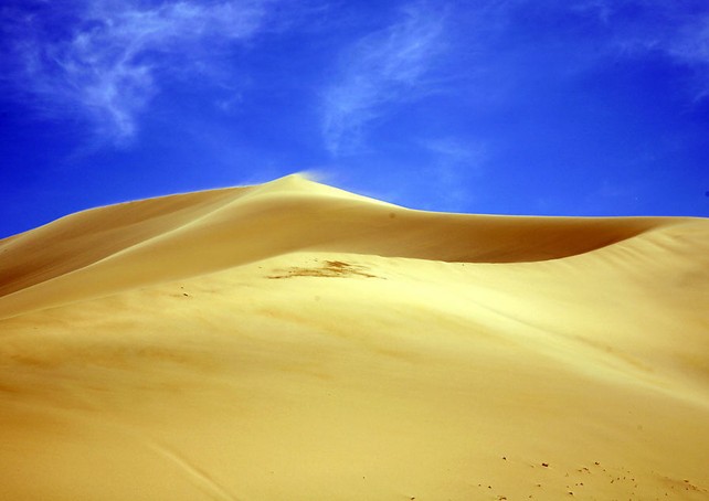 巴里坤鳴沙山位于新疆巴里坤哈薩克自治縣境內(nèi),西距縣城60公里,四周被豐美碧綠的草場(chǎng)所包圍,猶如湛藍(lán)大海中的一座金色小島。鳴沙山形似一朵蘑菇,高約百米,沙丘陡峭,其下有水泉,左右兩側(cè)有河流通過(guò)。據(jù)說(shuō)這里是唐代女將樊梨花西征遇難的地方,聽(tīng)到的沙鳴,就是女兵們當(dāng)時(shí)擂鼓助陣和沖殺鼓掌之聲。
