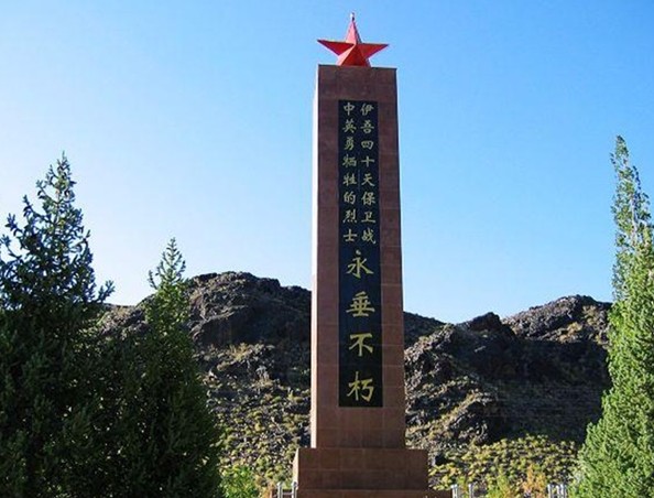 烈士陵園是伊吾人民為了緬懷在伊吾四十天保衛(wèi)戰(zhàn)中壯烈犧牲的革命烈士而建的。1950年春,在伊吾曾經(jīng)發(fā)生了震驚全國、震破敵膽的伊吾四十天保衛(wèi)戰(zhàn)。奉毛主席向新疆進軍、屯墾戍邊的命令,我解放軍一營二連全體官兵在全國戰(zhàn)斗英雄胡青山副營長的率領(lǐng)下先后進駐伊吾。1950年的伊吾偽縣長艾拜都拉與匪首烏斯曼、堯樂搏斯相勾結(jié),企圖以伊吾為據(jù)點發(fā)起大規(guī)模的武裝叛亂。解放軍進駐伊吾后,兵分三路,一路由全國勞動模范趙富貴連長帶領(lǐng)進駐淖毛湖,一路進駐下馬崖,還有一路由胡青山副營長駐扎在縣城。解放軍進駐伊吾后叛匪加快了叛亂活動,他們秘密切斷了電話線、破壞了交通、裹脅走了縣城的所有居民,我解放軍一營二連就是在這種內(nèi)無群眾支持、外無援軍的情況下,監(jiān)守山城四十個日日夜夜,終于堅持到大部隊援軍的到來,取得了伊吾四十天保衛(wèi)戰(zhàn)的全面勝利。彭德懷總司令發(fā)來慰問電嘉獎二連,并且被解放軍西北軍區(qū)第一野戰(zhàn)軍授予“鋼鐵英雄連”的光榮稱號。