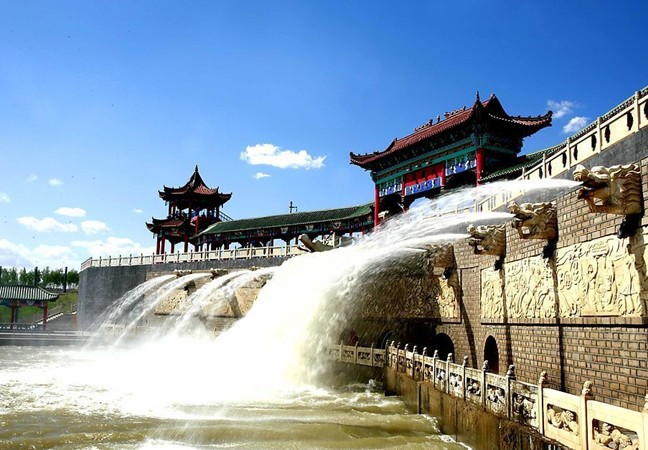 九龍?zhí)妒强死斠篮拥脑搭^所在,地處克拉瑪依河穿城風(fēng)景帶之首—東郊瀑布景區(qū)內(nèi)。該景區(qū)主要由高約8米的人工瀑布、瀑布下的巨潭和周圍大面積的綠化林帶草坪構(gòu)成。瀑布水源來自風(fēng)克干渠湍急的水流從中間的一條巨龍口中噴出,利用水的噴涌速度和自然重力形成寬約10米的巨大的瀑布,瀑布的兩邊分列的8條龍嘴也同時(shí)噴出水柱,構(gòu)成一副巨大的水廊。