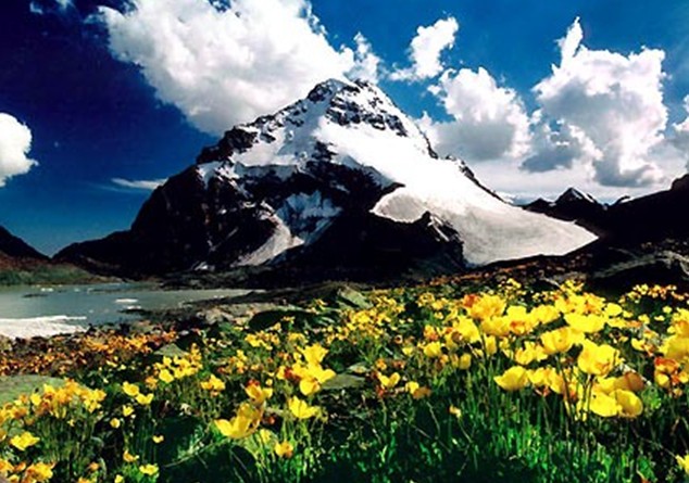 博格達(dá)峰頂冰川積雪,終年不化,銀光閃爍,與山谷中的天池綠水相映成趣,構(gòu)成了此地高山平湖的優(yōu)美景色。博格達(dá)峰上狂風(fēng)怒號(hào),氣候惡劣,溫度常在冰點(diǎn)以下,似乎很難相信那里會(huì)有生物。那里縱有少量的水也都凍成了冰??墒?,在冰雪覆蓋的沙石上,雪蓮以及其他無名花卉卻養(yǎng)成了驚人的適應(yīng)能力,居然能在這樣惡劣的環(huán)境中生,可以說是奇跡。博格達(dá)峰下起伏的群山,資源豐富。