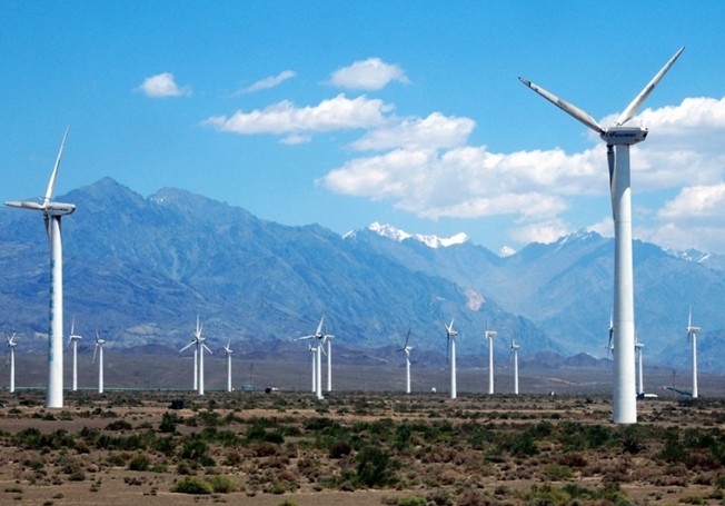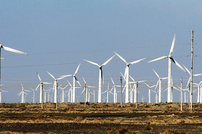 在烏魯木齊去吐魯番的途中,沿路南行,在通往絲路重鎮(zhèn)達(dá)坂城的道路兩旁,上百臺(tái)風(fēng)力發(fā)電機(jī)擎天而立、迎風(fēng)飛旋,與藍(lán)天、白云相襯,在博格達(dá)峰清奇峻秀的背景下,在廣袤的曠野之上,形成了一個(gè)蔚為壯觀的風(fēng)車大世界。這里就是目前我國最大的風(fēng)能基地——新疆達(dá)坂城風(fēng)力發(fā)電廠。