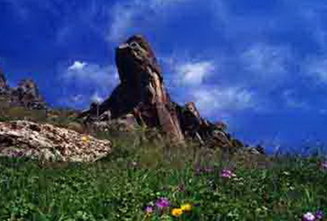 燈桿山距天池西岸4公里,于層巒峽谷中突兀崛起。主峰海拔2718米,頂峰聳立著3塊巨大的石筍,其狀如戟,直刺長空,又稱“頂天三石”。神話傳說是王母娘娘降妖伏魔的繡花鞋化生。這里是天池觀落日和欣賞古冰川地貌的絕好去處。