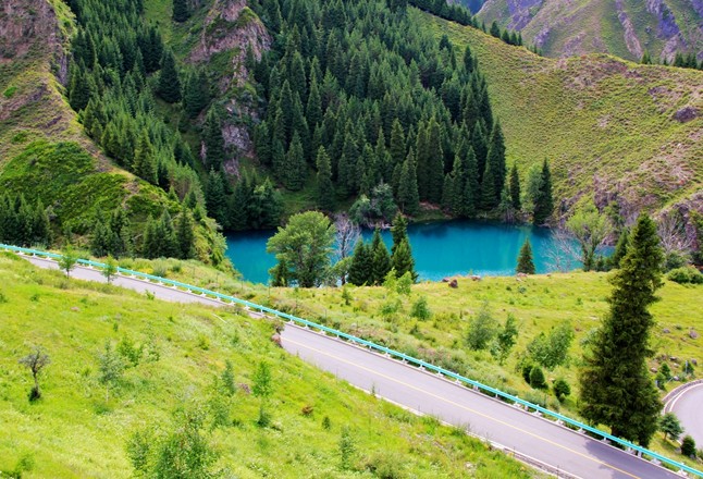 西小天池在天池腳下兩公里處的路旁,水面狀如滿月,池水清冽幽深。天山塔松環(huán)抱四周,池中有松樹(shù)的倒影。有時(shí)皓月當(dāng)空,靜影沉壁,清景無(wú)限,因而也被稱(chēng)作龍?zhí)侗淘隆3貍?cè)飛掛著一道瀑布,銀河落地,吐珠濺玉。池上山顛建有間濤亭,玲瓏別致。有人借用中國(guó)古代神話,說(shuō)西小天池是王母娘娘的梳妝明鏡。