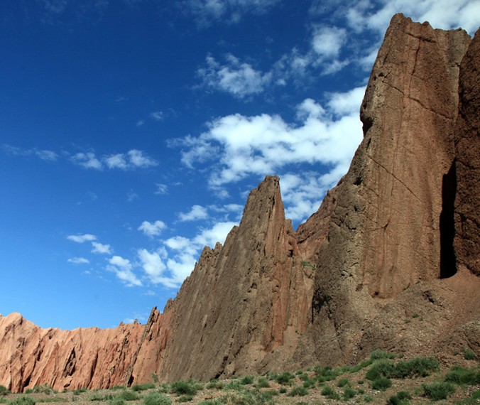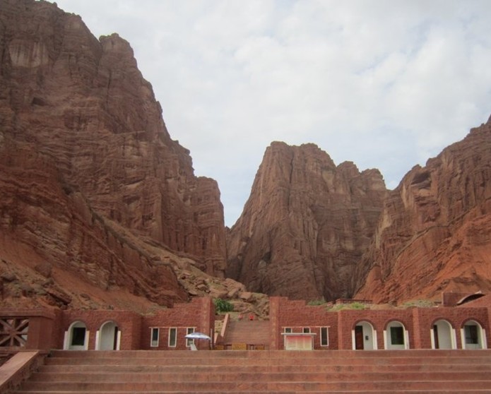 天山神秘大峽谷地處天山山脈南麓、庫(kù)車縣城以北64公里的山區(qū),位于217國(guó)道1025.8公里處北側(cè),海拔1600米,最高山峰2048米。大峽谷由紅褐色的巨型山體群組成,當(dāng)?shù)厝藗兎Q之為克孜利亞(維吾爾語(yǔ)意“紅色的山崖”)。峽谷南北走向,末端稍向東彎曲,全長(zhǎng)5000多米,經(jīng)億萬(wàn)年的風(fēng)雨剝蝕、山洪沖刷而成,是我國(guó)罕見(jiàn)的自然風(fēng)景奇觀。