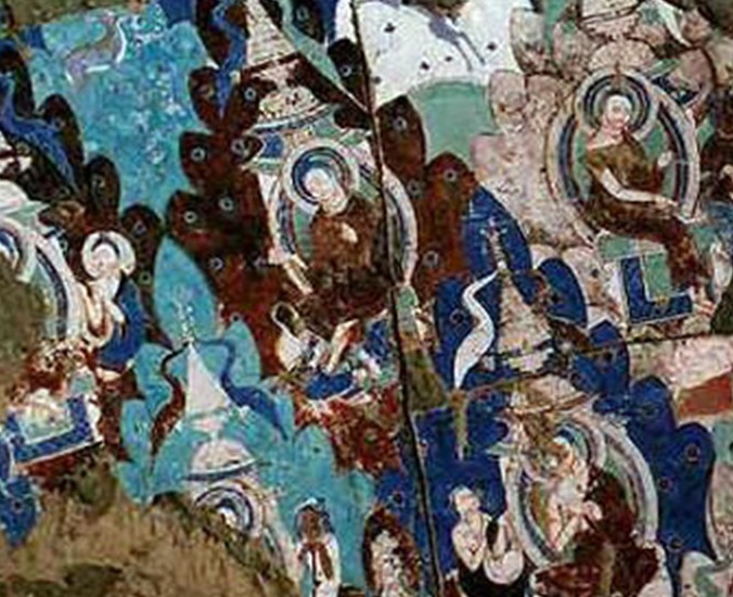 由于唐代是龜茲地區(qū)佛教的鼎盛時期,因此盛唐時開鑿的洞窟較多。在庫木吐拉石窟中,唐代的壁畫數(shù)量最多。它在內容和畫風上都和中原藝術比較接近。這一時期的主要特點是:既有中原畫那種豐富多變的線條,又有凹凸暈染法,并使二者有機地結合在一起,形成獨具一格的龜茲畫風。它運用了富有裝飾性的圖案作背景,以寫實傳真的空間,來襯托虛幻的宗教故事。這種手法,大量地使用在滿鋪窟頂?shù)牧飧癖旧?、因緣故事畫和菱格雙幡復缽式塔內的坐佛圖上。在橫豎斜向排列的菱格中,又畫出層層山峰,其間點綴著圖案化了的樹木、花卉、水池,再彩繪以形象生動、造型優(yōu)美的佛本生或因緣故事畫,使之動靜結合,圖案與寫實相呼應,主題形象突出,色彩濃淡相宜,畫面絢麗多彩,又富有裝飾意匠。
