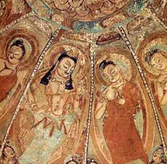 在后期的壁畫中,菱格故事畫雖被一排排的千佛像所代替,但在龕楣、背光、頭光和一些邊飾中,填充了許多卷草花卉、葡萄紋等圖案,畫面活潑流暢,氣象萬千。龜茲壁畫中的人物,形象生動。