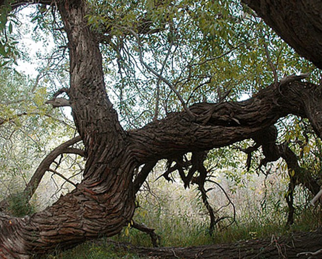 墓地周圍為戈壁荒丘,圓中卻以美麗奇特的大自然風光、豐富多彩的植物資源、古樸淳厚的少數(shù)民族文化而享有盛譽。園中的樹木種類很多,有楊樹、榆樹、柳樹、白蠟樹、還有核桃、杏樹等。那些蒼勁的古樹,有的曲折盤旋,貼地而伸;有的匍匐在地,猶如龍蛇之狀;有的軀干壯碩穩(wěn)固,枝條隨風起舞;有的樹頭與根部相連,分不清哪是根,哪是枝;有的樹倒地后,又從根部生出新枝,筆直向上,長成參天大樹。園中有一棵斜長的大樹,根部早已腐朽,而樹冠依然生機勃勃。園中最高大的一棵楊樹,據(jù)資料介紹高96.23米,直徑6.25米。