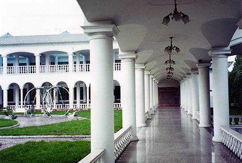 伊甸宮:一座中西合璧的建筑,中國傳統(tǒng)的庭院式與歐式建筑的線條、廊柱建筑風格相結合。通長的圍廊,漢白玉石柱,具有良好的裝飾性和使用功能,使您的戶外活動不受氣