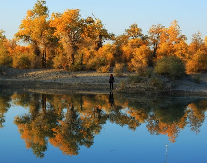 曠野上隨處可見輪臺油田高聳藍(lán)天的井架、排列齊整的鉆機(jī)和車隊(duì)以及井口噴射的朵朵烈焰,使昔日覺寂的荒原,充滿活力和生機(jī)。該公園現(xiàn)建有木頭賓館、磚砌的四合院接待站和食堂,可解決旅客的食宿。公園接待站后院高聳著一座二三十米高的了望鐵塔,登上塔頂,但見蔚藍(lán)的塔里木河蜿蜒曲折,散成眾多的汊流,汊流間布滿胡楊林。胡楊林海,順著塔里木河一直伸向茫茫天際,好不壯觀!森林公園色彩絢麗多變,綠樹、碧水、藍(lán)天,猶如一幅濃重的水墨畫。秋初黃綠相間,深秋一片金黃。公園中建有水榭、湖心亭,備有游船、汽艇可供開展巡河觀光。這里的河汊全長7千米,開始段呈長圓開如湖蕩,水中建有湖心亭,各種水鳥珍禽集隊(duì)飛翔鳴啼在湖面和森林中,湖中樹木倒影清晰,環(huán)境靜謐,空氣清新,漫步湖濱,令人心曠神怡;河汊中間段水面寬闊,汪洋一片,水波蕩漾,水中到處布滿奇開怪狀的枯樹與樹樁,船行其間猶如穿梭在梁山泊的水寨間,別有情趣,河汊末端水道收縮變窄,形成條條港汊,水流紋絲不動(dòng),水平如鏡,河汊兩邊的胡楊林連同藍(lán)天白云倒映水中,其影像比明鏡中的影子還要清晰逼真,令游人叫絕;河汊末端是蘆葦蕩和胡楊紅柳沙丘群,潔白的葦花蕩和胡楊紅柳沙丘群,潔白的葦花在逆光透射下發(fā)出誘人的銀白色光芒;牛、羊群悠閑地覓食在紅柳沙包中。登上沙丘頂,向南望,胡楊林一眼望不到邊;向北遠(yuǎn)眺,沙漠油井噴射的火焰映紅了藍(lán)天。這如詩如畫的美景迷倒了無數(shù)的游人,令人流連忘返,特別是那些攝影愛好者和畫家,在這里一住就是一周甚至半月。