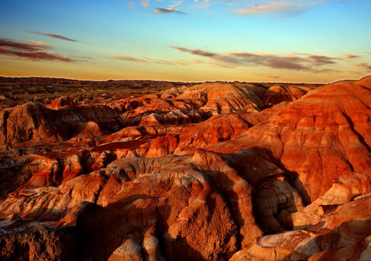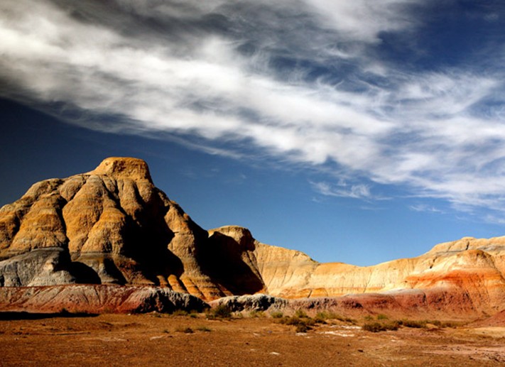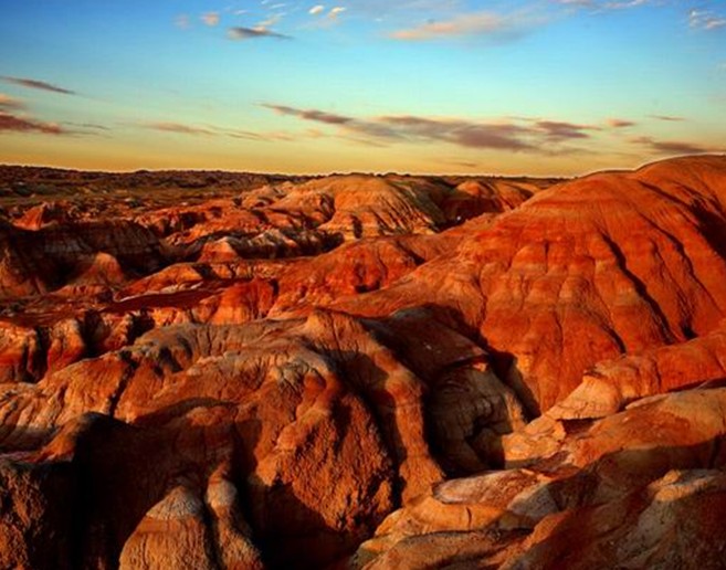 阿勒泰五彩城北距富蘊(yùn)縣城約280公里,海拔約650米。阿勒泰五彩城外觀屬丘陵地形,是受風(fēng)力和流水作用形成的侵蝕臺(tái)地,高一般10――20米,最高約50米,分布面積近10平方公里。 一般由傾角不大的侏羅紀(jì)地層構(gòu)成的阿勒泰五彩城,巖畫凹凸相間,巖石色澤多變,以紅為主,間以綠、黃、白、黑及過(guò)渡色彩,酷似五彩古堡。阿勒泰五彩城與烏爾禾魔鬼城的雅丹地貌相比更具有良好的視覺(jué)效果。