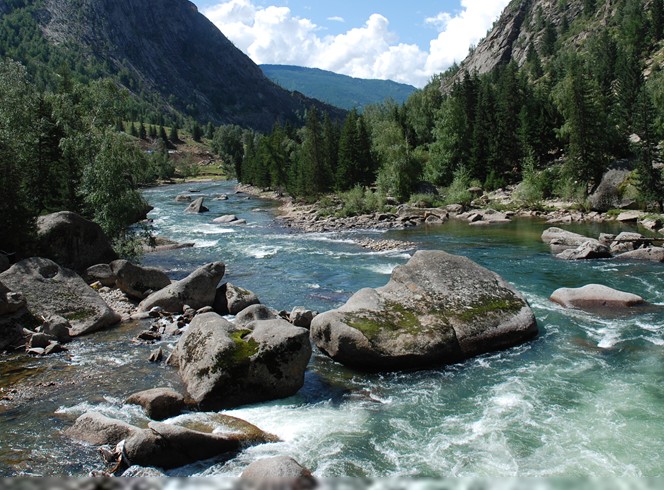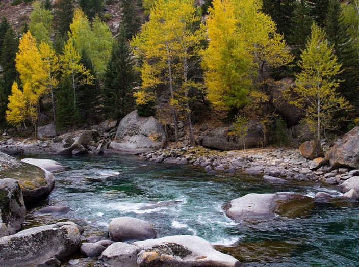 溫泉上游約100米處,有一飛瀑從巨石上直瀉而下,與奔騰的額爾齊斯河構(gòu)成一幅立體圖畫,瀑底海拔1459米,屬常年性流水瀑布,由崩落的花崗巖巨石堵塞卡拉卓勒溝谷,流水翻越巨石而形成。瀑布主體分為二級,上級高8米,下級高12米。從此處過橋,再往上走,河谷越來越窄,水流越來越湍急,森林越來越茂密,山路越來越艱險。僅在兩河交匯處的三岔河口,地勢相對開闊,綠草如茵,古松如塔。