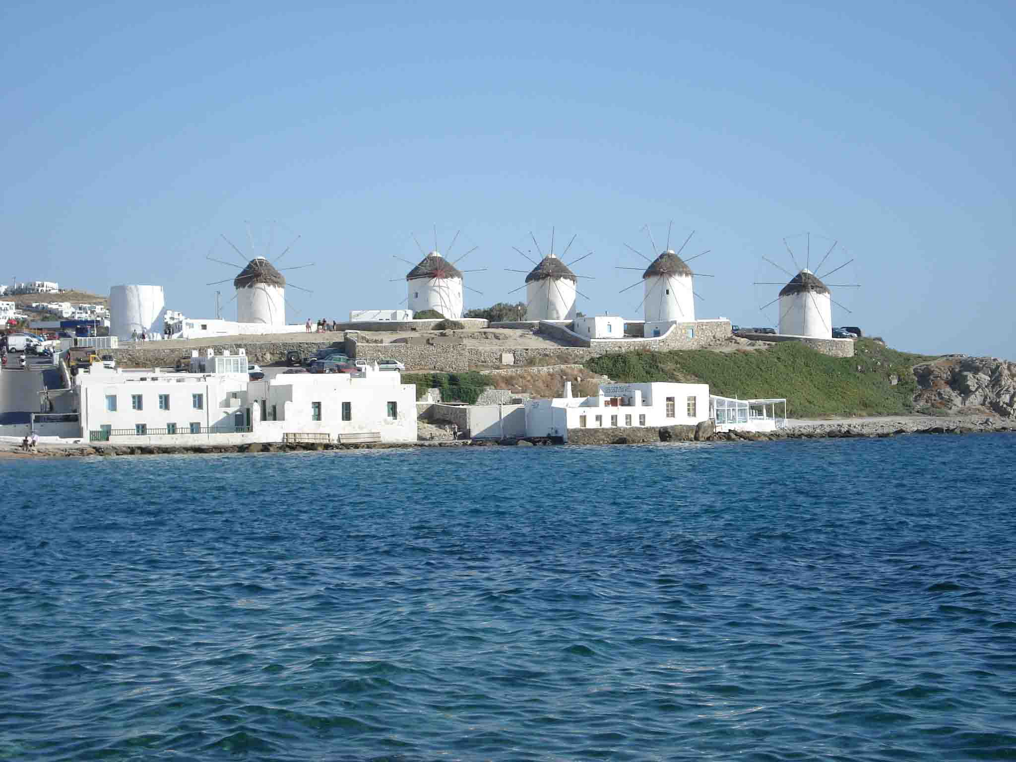 米克諾斯島是希臘南部基克拉澤群島中的一座,也是愛琴海上最享盛名的度假島嶼之一。島上居民很少,每年大約半年的非旅游時(shí)間,島上相當(dāng)安靜。四月以后,旅游季節(jié)開始了,來自世界各地的游客就像候鳥一樣絡(luò)繹不絕地飛來島上,享受地中海的陽光和海灘。在島上漫步,看到房頂都是用大石塊壘起的平頂,覺得很奇怪。問了當(dāng)?shù)氐木用窈蟛胖?,島上冬天寒冷,風(fēng)特別大,只有這些結(jié)實(shí)的屋頂才能抵御寒風(fēng)。在島西南面海邊的小山丘上,有5座基克拉澤式的風(fēng)車,這是米克諾斯島的標(biāo)志。