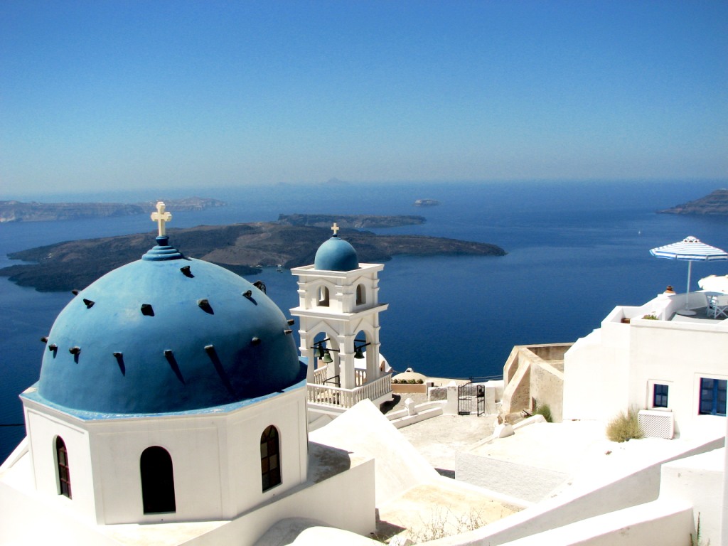 從米克諾斯島乘船到圣特里尼島約需5小時(shí)航程。來到以后,才知道很多觀光手冊(cè)和旅行社都把米克諾斯島和圣特里尼島作為推薦給游客的首選,是不無道理的。我們的油輪剛靠岸,大家就驚奇地發(fā)覺,海邊陡峭的山崖呈紅褐色,山崖的頂端是一片白色的房屋,小巧明麗。據(jù)說,該島位于世界兩大大陸板塊最深的海溝之間,原來是圓形的。3500年之前的一次火山爆發(fā),島嶼被震出一個(gè)大洞,一大塊月牙形的就成了主島,周圍還有幾個(gè)小島,其中一個(gè)小島納亞卡美尼至今還是活火山。