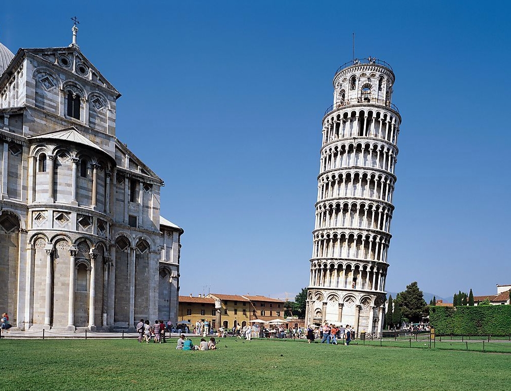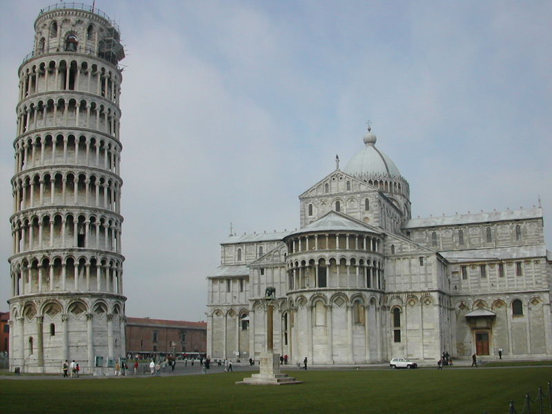 比薩斜塔(意大利語:Torre pendente di Pisa或Torre di Pisa)是意大利比薩城大教堂的獨立式鐘樓,于意大利托斯卡納省比薩城北面的奇跡廣場上。廣場的大片草坪上散布著一組宗教建筑,它們是大教堂(建造于1063年—13世紀)、洗禮堂(建造于1153年—14世紀)、鐘樓(即比薩斜塔)和墓園(建造于1174年),它們的外墻面均為乳白色大理石砌成,各自相對獨立但又形成統(tǒng)一羅馬式建筑風(fēng)格。