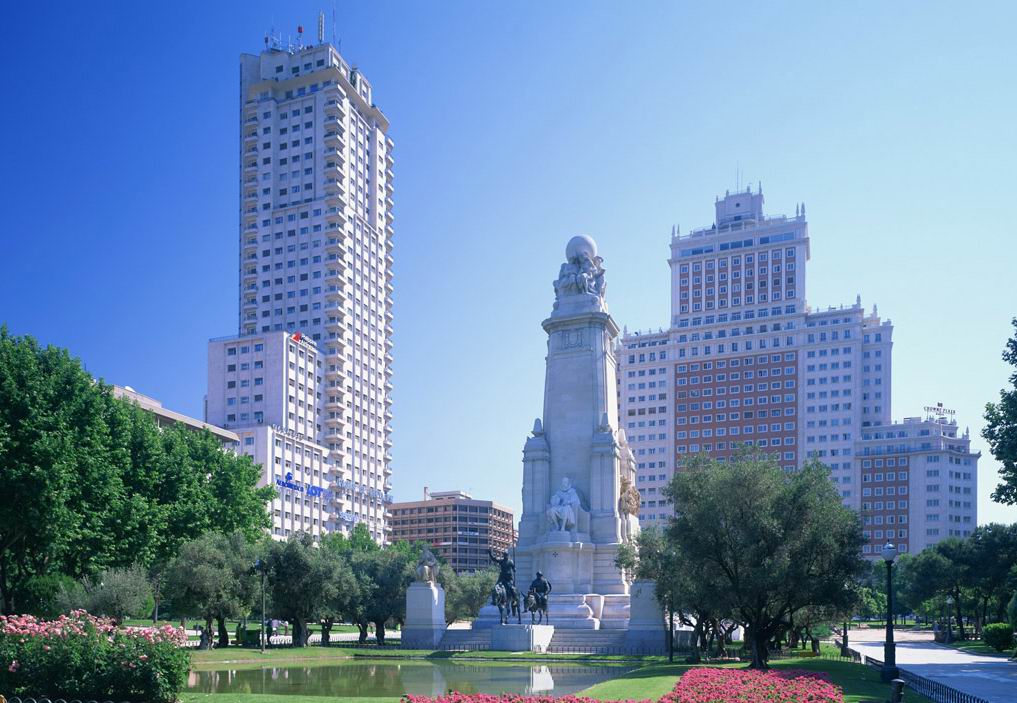 市內現代化的高樓大廈與風格迥異的古建筑摩肩并立、相映生輝。樹林、草坪和各種造型別致的噴泉和雕有古代小亞細亞人尊崇的自然女神尼貝萊塑像噴泉最吸人入勝。宏偉的阿爾卡拉門坐落在阿爾卡拉街頭的獨立廣場上,共有5道拱門,是馬德里著名的古建筑之一。財政部、教育部和西班牙的主要銀行坐落在阿爾卡拉大街兩側,建于1752年的王家美術學院收藏著牟利羅和戈雅等西班牙美術大師的名作。巍峨的塞萬提斯紀念碑聳立在西班牙廣場上,碑前有堂吉訶德和???bull;潘扎的塑像,巨大的碑身倒映在前面的水池之中,碑兩側是蔥郁的樹木;有“馬德里塔”之稱的西班牙摩天大廈位于廣場一側。