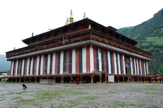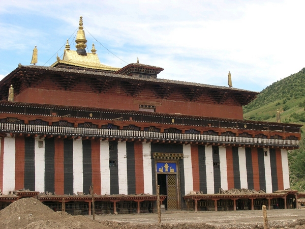 大殿坐西朝東,總建筑面積3334.64平方米。建筑主體呈四方形,邊長53米,殿內(nèi)柱子林立,共聳立180根柱子,其中64根柱子高約15米。殿堂為三層,高48.15米。下層樓見方長53米,中層每面長度為 40.30米,上層每面長度為12米。這些柱子將殿中的天窗托起,使得原本封閉的大殿,透漏出明亮的光線,較好的解決了藏式寺廟建筑中通風(fēng)透氣不暢、光線不足的問題。