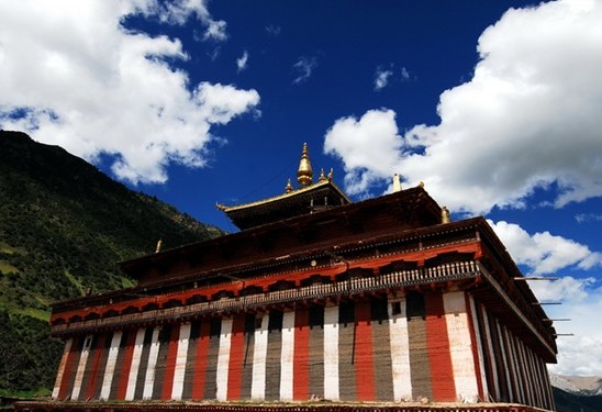 查杰瑪大殿的紅殿和白殿逐漸向里收分,又飾以飛檐金頂、呈飄逸升騰之勢。加之整座大殿在顏色運(yùn)用上十分豐富版權(quán)所有聊城聊之旅國際旅行社有限公司,轉(zhuǎn)載必究!,對比強(qiáng)烈,上白中紅下花,極富層次和立體感。經(jīng)過巨大的寺門進(jìn)入殿中,抬首隨處可見雕塑精美的菩薩神佛塑像和不計其數(shù)的唐卡。查杰瑪大殿是類烏齊寺的主殿。大殿為三層,分別由三種顏色繪飾。第一層為“條花殿”,墻高13.5米,外墻用紅、白、黑三種顏料涂添豎形紋飾,每道豎條有1米多寬。殿內(nèi)有巨型大柱64根,每根筆直粗大的木柱高達(dá)15米。第二層為 “紅殿”,外墻涂抹紅色,樓高9米。第三層稱之為“白殿”,墻體涂白色,樓高5米。殿頂有金頂直指蒼穹。