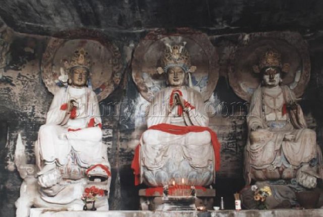 三壁三龕佛殿窟: 有南三、五、七、北三??叻智袄群笫遥掀?、北三)面闊為三間四柱,明間正中開窟門,次間各開大龕,龕內(nèi)雕踏山力士像,明間上部為印度式拱,次間額枋上為一斗三升拱。版權(quán)所有山東聊城聊之旅國際旅行社有限公司,轉(zhuǎn)載必究窟檐雕出仿木結(jié)構(gòu)建筑形式的滴水、圓椽、筒瓦等,瓦垅上有八層疊澀基,基上浮雕大型山花蕉葉覆蓋窟頂,大蕉葉擁托覆缽丘,丘上雕出象征塔剎的雙層火焰寶珠??邇?nèi)平面方形、穹隆頂,正、左、右壁各開帷幕帳形龕,龕內(nèi)雕一鋪三尊(南五)、五尊(南七)、七尊(北三)像,窟頂浮雕蓮花藻井及飛天伎樂,地面浮雕大蓮花,蓮花中間置博山爐(南五)窟門兩側(cè)刻大番卷草紋和連珠紋,上部刻飛天。