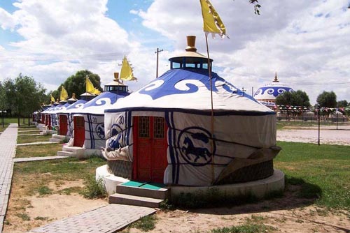 四、賽馬、摔跤、射箭場:從餐飲住宿部向東南行走500米,到蒙古族娛樂活動(dòng)的中心,賽馬場,每年的那達(dá)慕大會(huì)就在這里召開。在高天的主席臺(tái)兩側(cè),排列著階梯形的觀禮臺(tái)。周長兩公里的封閉式賽馬道開闊平坦。騎手們穿著五彩繽紛的民族服裝,在賽道上飛奔,游人們情不自禁的跨上駿馬加入到賽馬的行列,一表騎馬風(fēng)采。