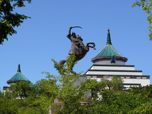 成吉思汗廟坐落在興安盟烏蘭浩特市罕山之巔,始建成于1940年,這座融漢、蒙、藏三個(gè)民族建筑風(fēng)格于一體的廟宇,從正面看是"山"字形。正殿當(dāng)中有16根粗大的紅漆明柱,四周繪有反映成吉思汗業(yè)績(jī)的精美圖案,中央為2.8米高的成吉思汗銅像;兩偏殿陳列有元代的兵器,服裝,瓷器等復(fù)制品,山門(mén)到正殿有寬10米、長(zhǎng)158米用花崗巖砌成的81級(jí)臺(tái)階。