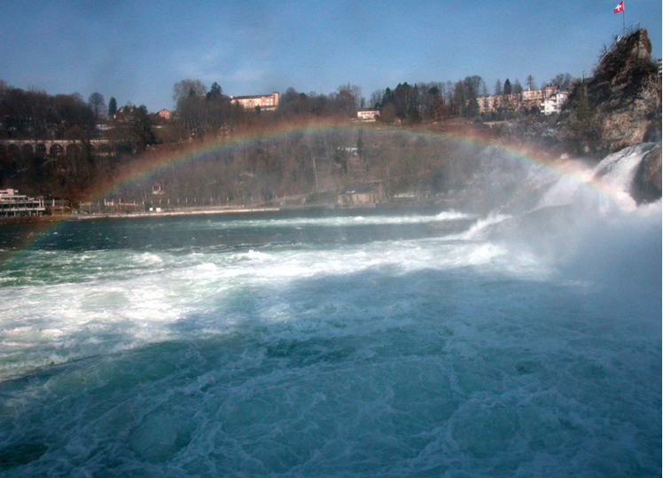 中歐最壯觀的瀑布,在瑞士北部萊茵河上游。包括一些險(xiǎn)灘在內(nèi),全部落差約30米(100呎),寬150米(492呎)。一塊柱狀巖石把瀑布分成兩個(gè)主要部分,位于河右岸的落差約15米(50呎),左岸約20米(65呎)。