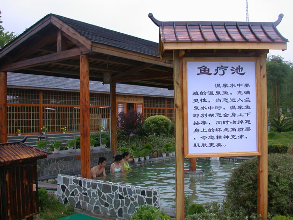 占地200畝的度假村內(nèi),建筑中西合璧,古今交融,格調(diào)新穎,氣勢(shì)恢宏,景色秀麗迷人,盛世漢唐景象與異國(guó)風(fēng)情在這里盡情顯現(xiàn)。自然園林式的露天溫泉區(qū),整體布局保持天然風(fēng)貌,怡人清新的鄉(xiāng)土田園格調(diào),青石板路縱橫交錯(cuò),亭臺(tái)廊榭,假山瀑布,小橋流水,鳥(niǎo)語(yǔ)花香,綠意蔥蘢,30多個(gè)大小形狀不一,功能各異的溫泉池座落有致,一池一景,老少皆宜,自然悅心。讓賓客遠(yuǎn)離都市的繁囂,身心舒泰,真正溶入大自然,沐浴大自然,享受大自然。
