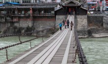 瀘定橋又稱鐵索橋,位于四川省瀘定縣大渡河上,相傳康熙帝統(tǒng)一中國后,為加強川藏地區(qū)的文化經(jīng)濟交流而御批修建此橋,并在橋頭立御牌。該橋始建于1705年,建成于1706年,是中國古代橋梁建筑的杰作,是國務(wù)院首批公布的全國重點文物保護單位。 瀘定橋長103米,寬3米,13根鐵鏈固定在兩岸橋臺落井里,9根作底鏈,4根分兩側(cè)作扶手,共有12164個鐵環(huán)相扣,全橋鐵件重40余噸。瀘定橋兩岸的橋頭古堡為傳統(tǒng)木結(jié)構(gòu)古建筑,為中國獨有。