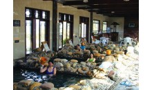 投資2.3億元依山而建的古兜溫泉,集山、泉、湖、海為一體,風(fēng)景優(yōu)美,有著豐富的溫泉資源,在古兜山下新近落成的溫泉谷,格調(diào)高雅,打造出一個(gè)不同凡響的溫泉王國。溫泉谷中間有一條約150米長的人工鵝卵石河道,它不僅為景區(qū)增添了春山幽谷的野趣,更和中央水區(qū)的大舞臺(tái)及各大小泡池相連,將谷內(nèi)建筑群落自然分成了三大區(qū)域:北邊是歐式風(fēng)格的“羅馬殿”,東邊則是日本和式風(fēng)格的“東瀛閣”,南邊是“唐宮”。