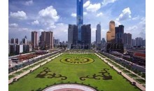 天河?xùn)|站綠化廣場位于廣州市新城市軸線上,占地面積4.7萬平方米,于1998年9月中旬動工,1999年7月1日正式完成并交付使用。廣場中央綠地2.6萬平方米,鋪種馬尼拉草18315平方米,其中有6000平方米種植標(biāo)志性的紋樣,分圍種植1300平方米的福建茶綠籬。中央草坪四周設(shè)有41個(gè)花池,24個(gè)柵池,24個(gè)花缽,廣場綠化率達(dá)82%。仿南越王墓制式花壇,遍植各種嶺南花卉。