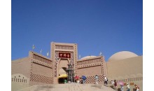 煙云燎繞的火焰山下,郁郁蔥蔥的木頭溝畔,一座規(guī)模宏大的人文 景觀,以其獨(dú)特的藝術(shù)風(fēng)格,屹立在312國(guó)道西側(cè),它就是1991年5月對(duì) 外開放接待游人的新疆大漠土藝館, 地理坐標(biāo)89°32′7″E,42°56′ 8″N,海拔140米,由312國(guó)道的勝金口往北拐上前往柏孜克里克干佛洞的旅游專線公 路四公里處,便可看到大型停車場(chǎng)后的高坡上矗立著一座高大的民族風(fēng)格建筑群,正中是十四米高的磚砌圖案大門.