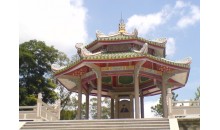 位于海豐縣城北面的五坡嶺上(編者注:彭湃中學后面),坐西北向東南,占地960平方米。前面分五層34級臺階,臺階上面是一幅長20米、寬13米的月臺,中心建一重檐攢尖頂,通高9米。亭內(nèi)后側(cè)再置一廡殿頂小石亭,高3.9米,內(nèi)豎一碑,高2.7米,寬0.9米,刻文天祥畫像。該亭為紀念南宋民族英雄文天祥當年方飯五坡嶺時不幸被捕而建,故取名“方飯亭”。