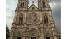 廣州石室天主教堂在市區(qū)一德路,清同治二年奠基,光緒十四年落成,歷時二十五年,是全國最大的一座以高直尖頂為特色的哥特式教堂。教堂結(jié)構(gòu)為一巍峨高聳的雙尖石塔,其上掛有大鐘一組,堂深78.69米,東西寬35米,高度由地面至天面平臺為28.7米,由天面平臺至塔頂端為29.8米,共高58.5米,堂內(nèi)是尖形肋骨尖叉的拱形穹窿,正面的大門和四周玻璃鑲嵌,可避免室外強(qiáng)光射入,使室內(nèi)光線保持柔和。