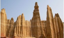 虎跳灘土林位于元謀縣城西北32公里的物茂鄉(xiāng)虎溪行政村,又稱物茂土林,芝麻土林,總面積2.3平方公里?;⑻鵀┩亮中螤钜猿潜睢⑵溜L(fēng)狀、簾狀為主,高度一般10?15米,最高27米。